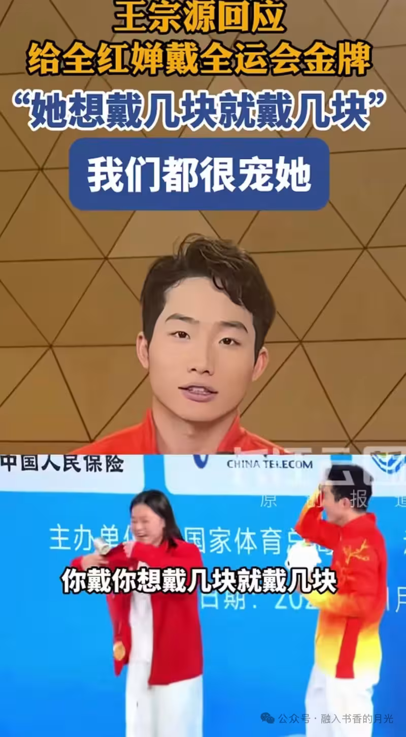 「想戴幾塊就帶幾塊!」這是該有多寵啊!王宗源這次的表現真的又是出圈了,面對全紅嬋,沒有一點架子,還主動配合,甚至把金牌都遞給她,這是表示喜歡這個小妹妹,更是一種尊重,還是一種好玩的心態,這也更進一步體現全紅嬋是團寵!