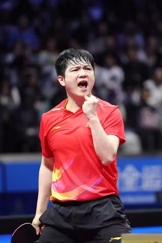 2025年11月16日,上海隊選手樊振東慶祝獲勝。當日,在澳門舉行的第十五屆全國運動會桌球男子單打金牌賽中,上海隊選手樊振東4比1勝海南隊選手林詩棟,奪得冠軍。 新華社記者 陳斌 攝