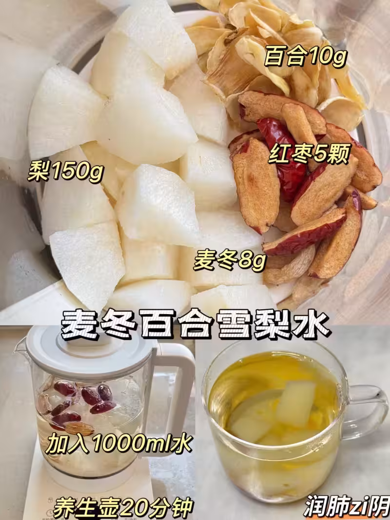 薏米茯苓雪梨水:梨 15g+茯苓 10g+薏米 15g+水 1000ml