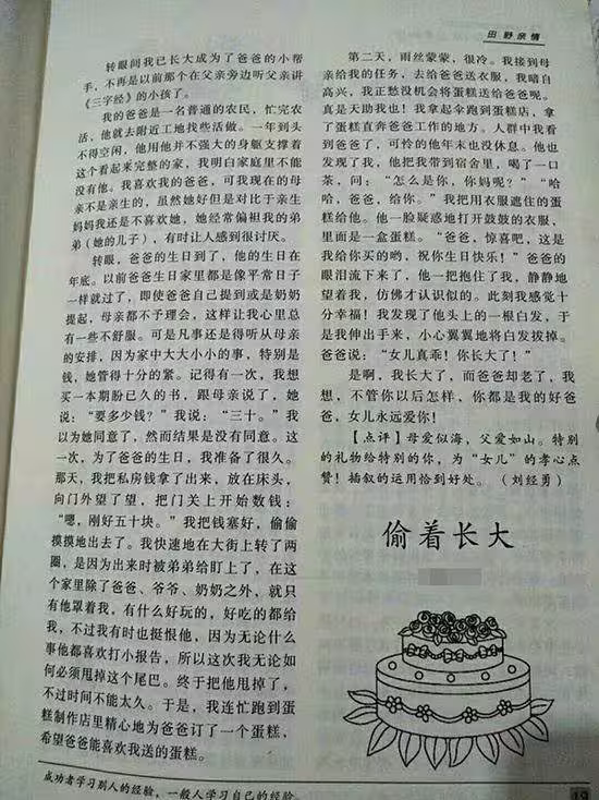 據了解,這名14歲女孩慶慶(化名)在半年前曾經在校刊上發表一篇《偷著長大》的文章,內容在敘述後母對錢管得緊,於是她自己偷偷存錢,給父親買生日蛋糕陪父親過生日的經過,被學校評選為優秀作文,她在文章中提到,她跟後母說要買書一本30元,但後母不同意,為了給爸爸慶生,我把自己偷偷存的錢拿出來,買了一個50元的蛋糕,結果剛好那天后母要我幫父親送衣服,「真是天助我也!」