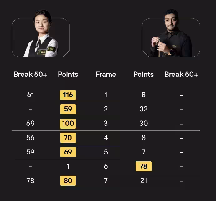 可惜在晉級輪與「小司機」傑克-利索夫斯基的比賽中,她以1-6無緣正賽。儘管如此,連勝三位男選手也創造了神奇紀錄。來到2025年英錦賽資格賽第一輪,白雨露的對手是穆斯塔法-多爾格姆,她以6-1戰勝對手,強勢晉級第二輪,祝賀白雨露!