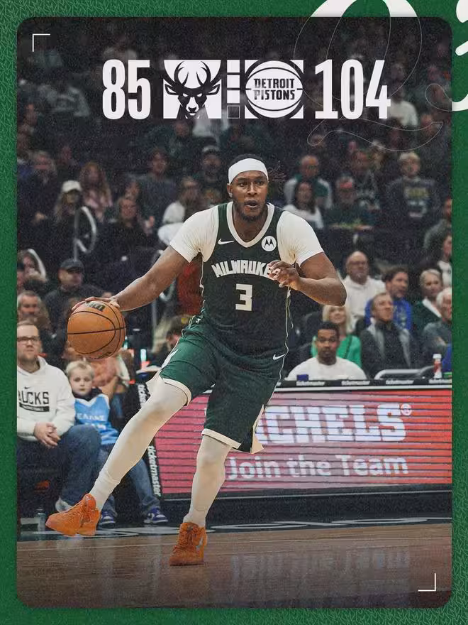三節打完,活塞104-85領先19分。第四節其實沒有多大懸念了,活塞主力又上去打了一會,正式帶走比賽。全場結束,活塞129-116擊敗雄鹿。活塞豪取12連勝,14勝2負穩居東部第一。活塞領先第二的猛龍3個勝場,優勢比較明顯。
