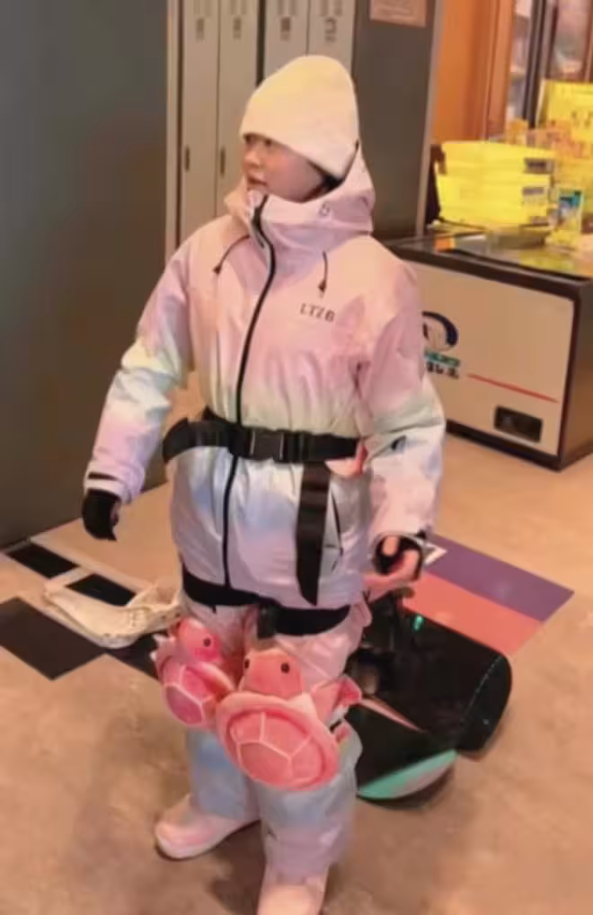 雖然全紅嬋已經18歲了,可是在滑雪教練跟前,還是小小的、看起來就像個孩子。因為是初次嘗試滑雪運動,全紅嬋也是坐在了準備。雙腿的膝蓋上都裹裹著小烏龜的墊子,屁股上也是小烏龜墊子。