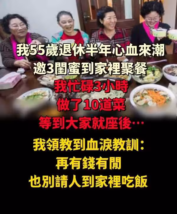 我55歲退休半年, 心血來潮邀3閨蜜到家裡聚餐,我忙碌3小時、做了10道菜,等到大家就座後…我領教到血淚教訓:再有錢有閒,也別請人到家裡吃飯。