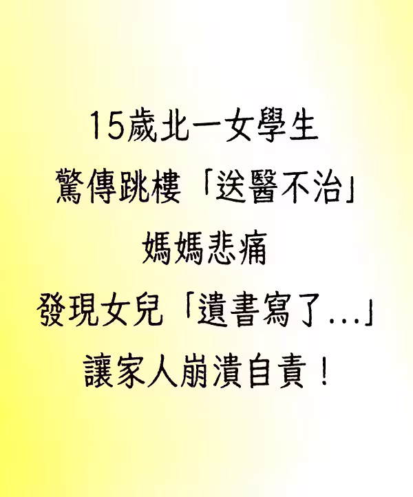 快訊/15歲北一女學生驚傳跳樓「送醫不治」!媽媽悲痛發現女兒「遺書寫了...」讓家人崩潰自責!