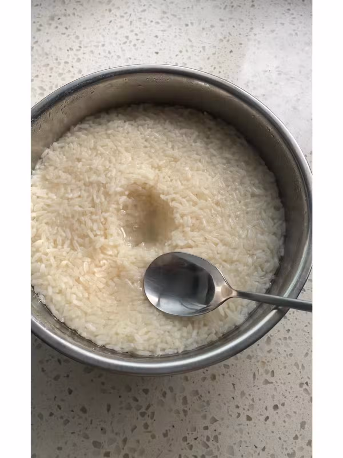 5.將糯米倒入容器中散開,隨後加入事先準備的涼白開,使糯米飯顆顆分明散開