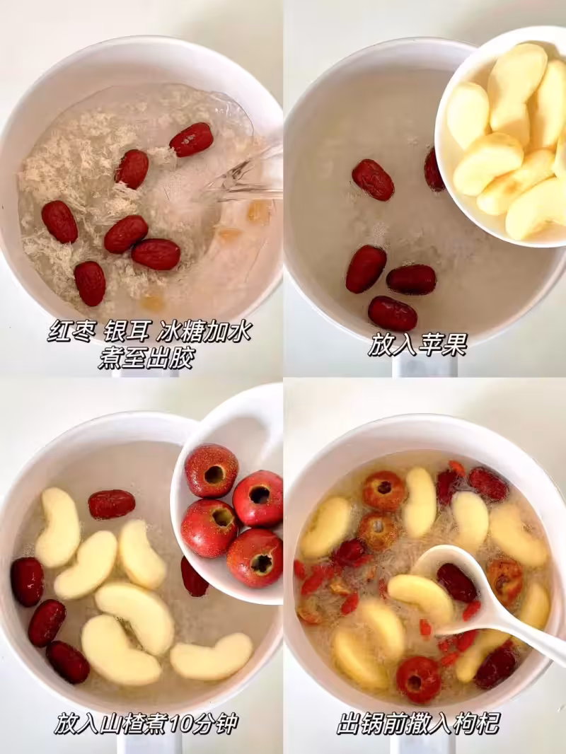 1️⃣ 銀耳提前泡發撕成小朵,與紅棗、冰糖一起放入鍋中,加水煮至出膠。