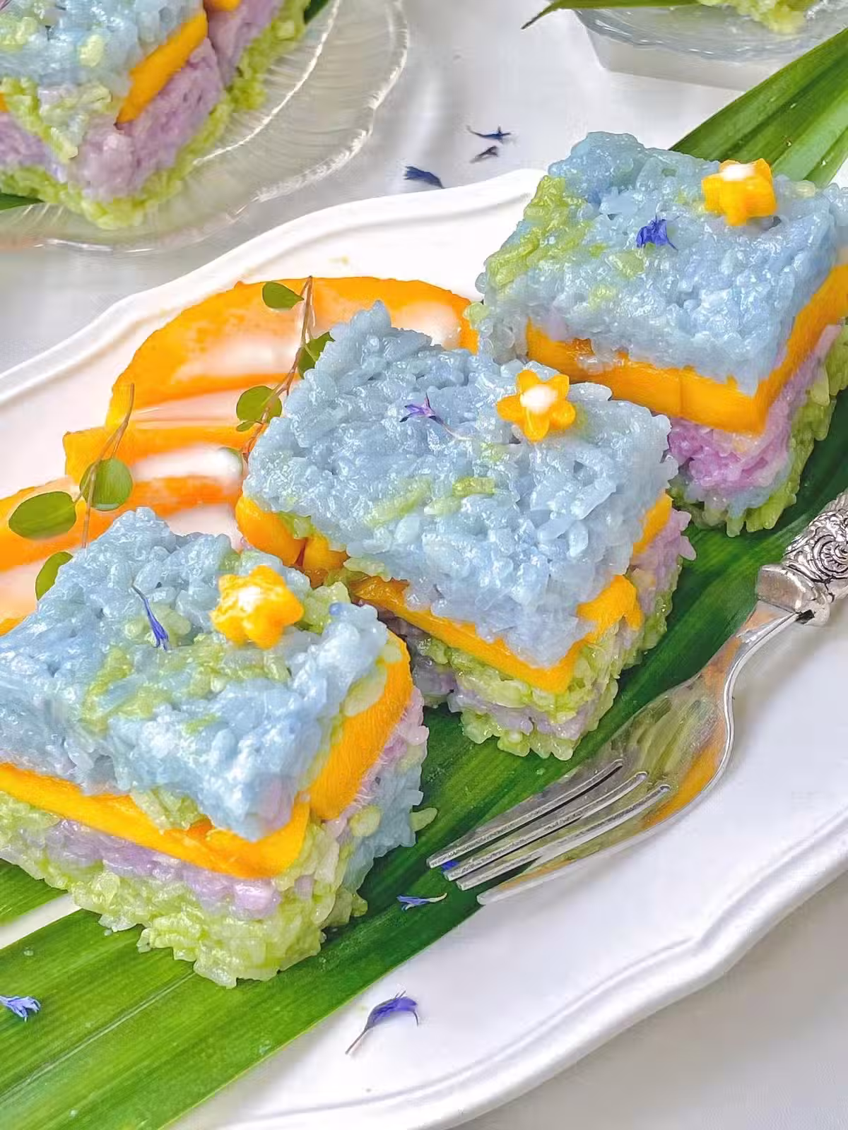 🍮彩色糯米飯🧾:糯米200g|斑斕和幾片|蝶豆花適量|檸檬🍋汁幾滴|斑斕精華適量|椰漿適量