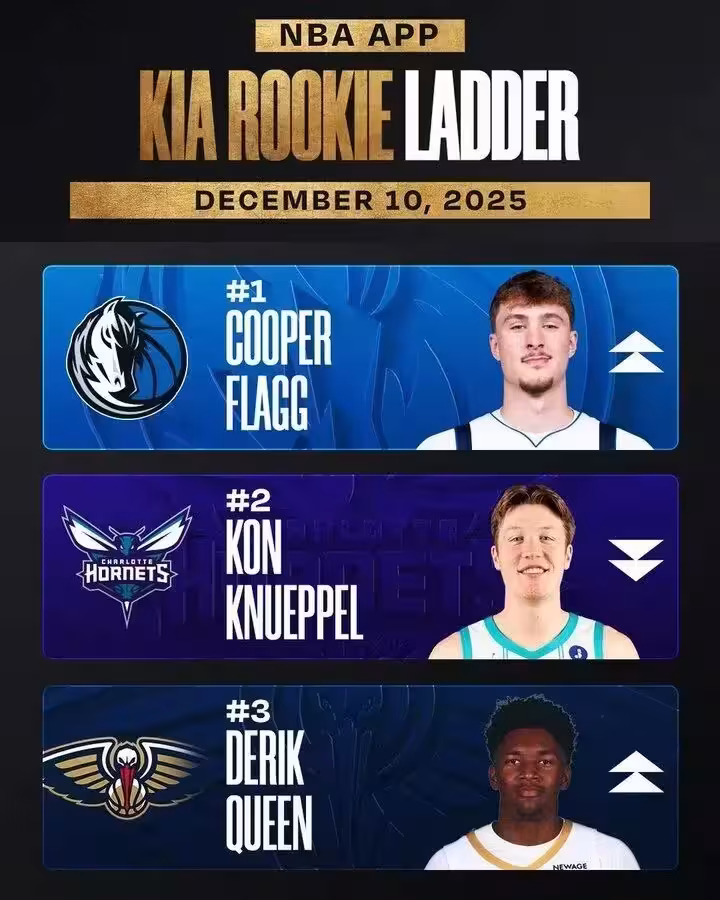 NBA官方公布最新一期的新秀排行榜,狀元弗拉格終於登頂,4號秀克努佩爾排名第二,13號秀奎因位列第三。本賽季開季前兩周的新秀榜,探花秀埃奇庫姆霸榜,如今他已經跌至第6位。過去幾周的新秀榜,克努佩爾穩居第一。