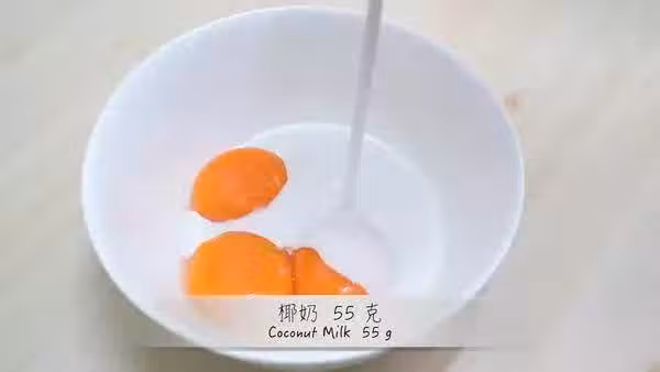 雞蛋3個、糖60克、低筋麵粉60克、椰奶55克、植物油30克、班蘭香油1茶匙