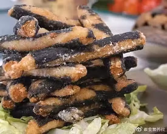 6、放入熱油鍋中炸至金黃色,撈出瀝油,擺入盤中,灑上胡椒鹽,即可食用。