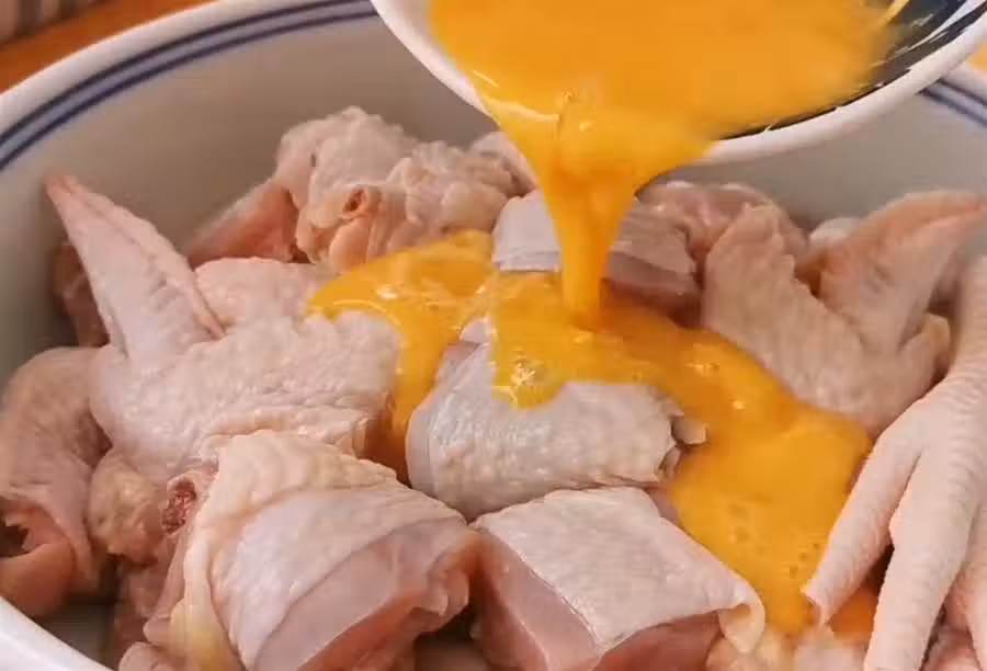 7,碗中打入三個雞蛋攪拌均勻倒入肌肉中,再加入適量的澱粉抓拌均勻,使每一塊雞肉都能夠均勻的沾上澱粉
