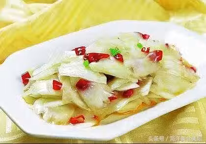 1、大白菜剝去老幫洗淨,在中部切斷分成兩半。把白菜幫這段白菜的根向上立起來,刀與白菜幫成30度角,片切白菜幫,邊切邊轉動白菜,直到全部切好
