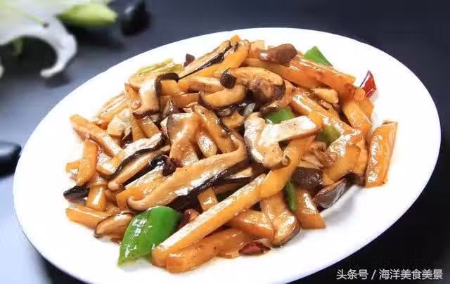 2、起鍋熱少許油,將土豆條煎至七、八成熟,加入香菇翻炒,同時淋少許醬油和水,快熟時放入青紅椒絲,並用鹽、蘑菇精調味即可。