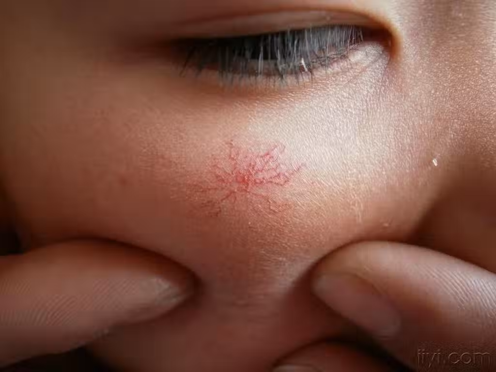表現為皮膚上一個或多個紅痣,中央凸起,向周圍放散狀延伸許多毛細血管,形似蜘蛛腿,按壓中心周圍可褪色,去除壓力後再次變為紅色。
