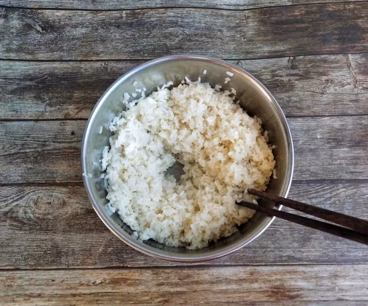 5、提前把水燒開了以後晾涼一定要用涼開水開始倒進糯米裡面,這樣經過殺菌以後的糯米就不容易長黑點,還有筷子和容器都要保證是無水無油的,經過熱水殺菌以後的。