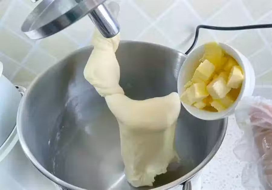 7、大約揉3分鐘,切下少許麵團,檢查麵團狀態,能拉出面膜就可以,不要求很薄。