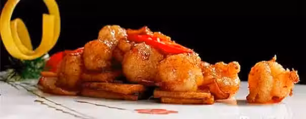 大蝦仁、杏鮑菇,薑片、紅美人椒節,美極鮮醬油、燒汁。