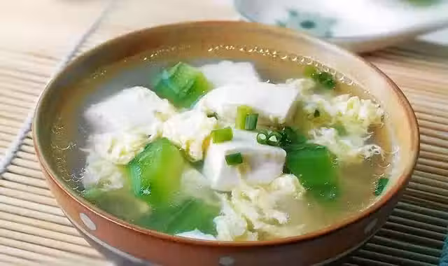 食材:絲瓜1條、雞蛋2個、豆腐1塊、姜1片、蔥1根、鹽適量、油適量