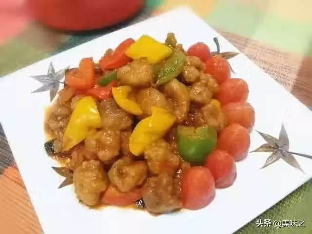 裡脊肉、黃甜椒、紅甜椒、青椒、聖女果、番茄汁、馬鈴薯澱粉、陳醋適量、料酒、適量、胡椒粉、蔥蒜、鹽。