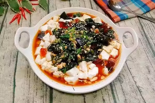 5. 把切好的豆腐擺放在盤子裡,再倒入切好的皮蛋。淋上調料汁即可。