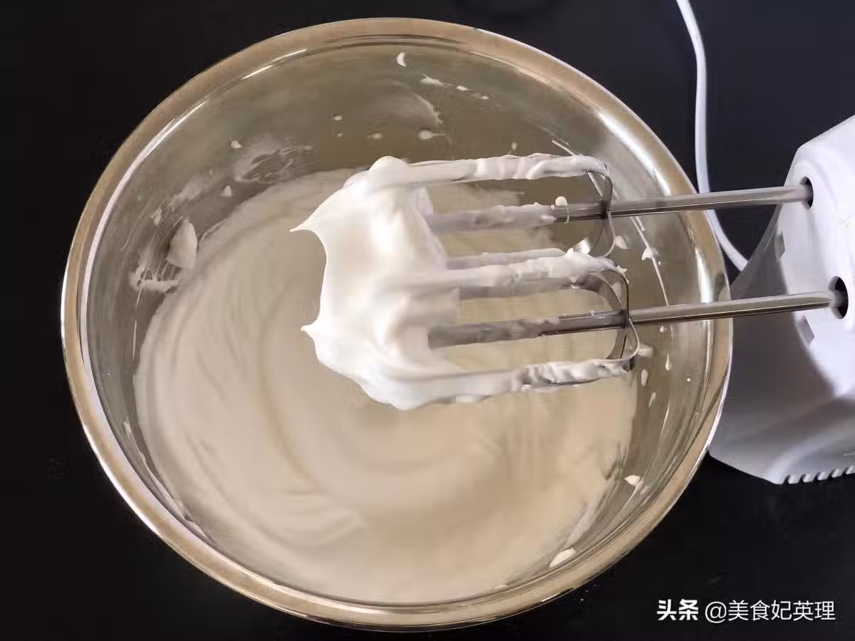 5.最終要的狀態是硬性打發,即提起打蛋頭出現短而堅挺的小尖角,盆中的蛋白有明顯的堆積感,就打發好了
