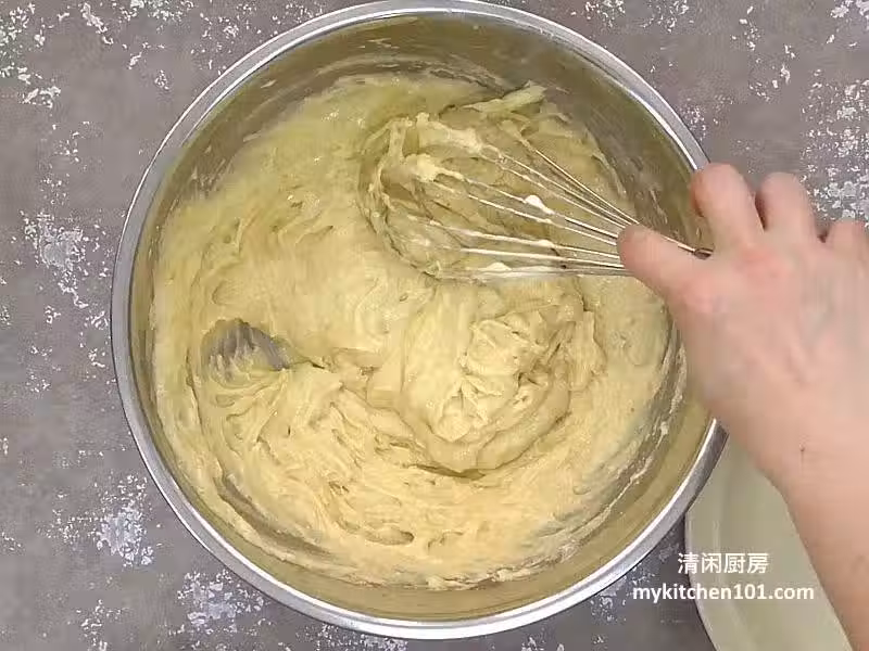 11 加入其餘的蛋糊,用人工攪拌器輕輕混合。