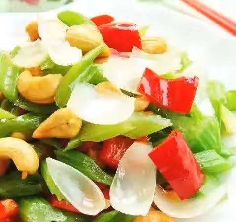 百合50克;西芹100克;腰果50克;紅椒半個;鹽1/4小匙;砂糖1/2小匙