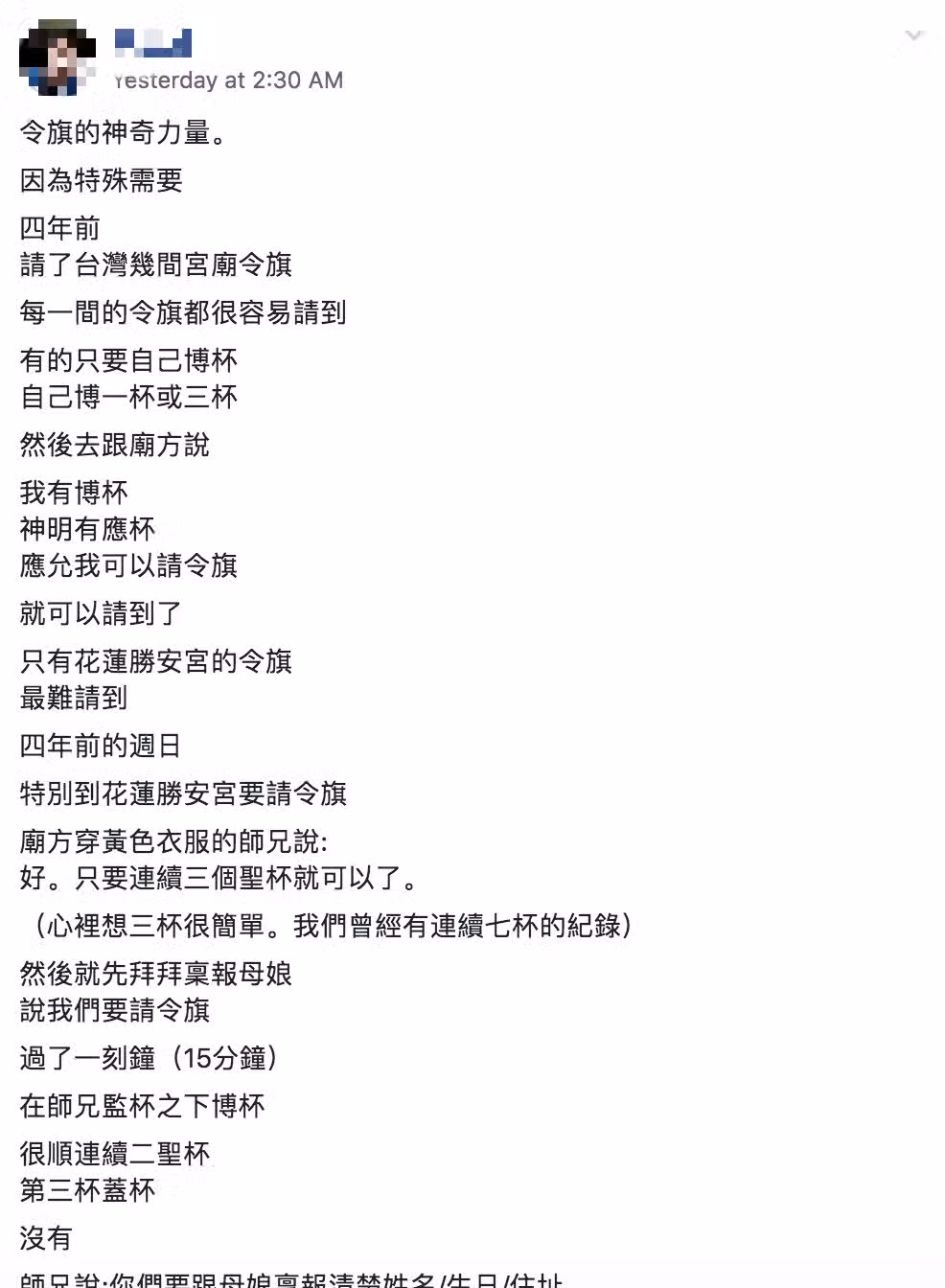 看完他的經歷後,網友們也忍不住驚嘆,紛紛留言表示,「真的不能小看令旗」、「無形中的提醒,讓你躲了不少劫啊」、「王母娘娘慈悲」。最後也有不少人好奇,請令旗到底有什麼作用?對此,就有專業網友解答,其實每一支令旗都代表著一位神尊,通常信徒請回家,是可以拿來鎮宅保平安的。