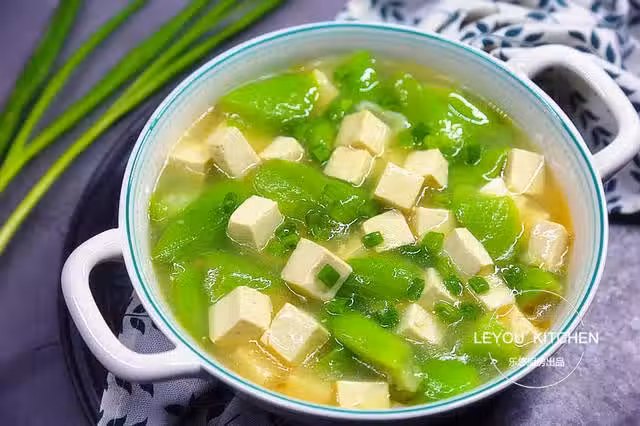第一步:準備食材。絲瓜1根、豆腐1塊、姜蒜適量。