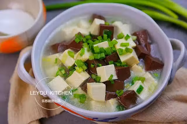 第三步:鍋中倒入適量的水燒開,然後把豆腐和鴨血放入鍋中,再放入1勺鹽煮開。(放入一勺鹽,可以使豆腐口感嫩滑、不易碎,還可以去除鴨血中的腥味。)