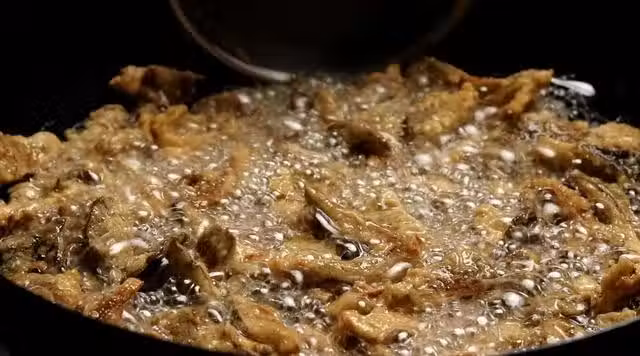 5.將炸好的蘑菇晾涼,再次將油溫燒至8成熱,放入蘑菇復炸一遍,復炸的時間不用太長,下鍋後大概炸10秒鐘就可以撈出控油了,經過復炸之後蘑菇會更加酥脆好吃,喜歡吃辣椒的朋友也可以撒上辣椒麵和孜然。