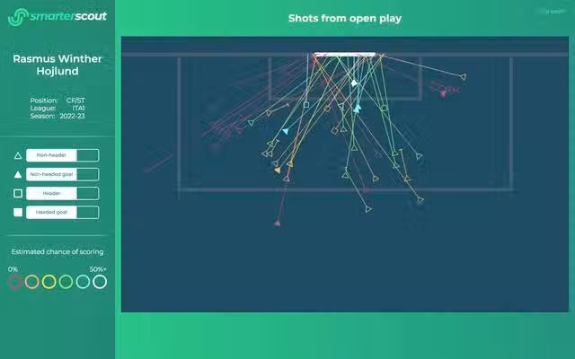 可是,霍伊倫德表現出來的天賦真的不錯。他的射門非常靠譜,54次射門打進了9個進球,射正率高達51.8%,射門轉化率17%。而且他的射門非常靠近球門,平均射門距離為12.9米,如果結合場均在禁區內6.53次觸球的數據、接應到10.99次推進傳球的數據,很明顯霍伊倫德是具備在禁區內對抗拿球、轉身完成射門能力的。