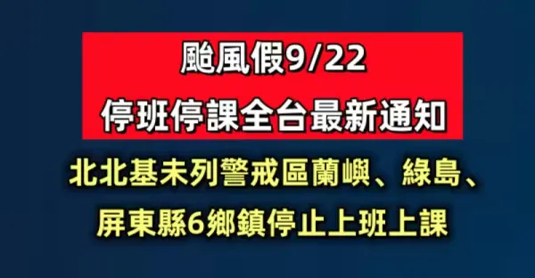 快訊/颱風假9/22停班停課全台最新通知 ,北北基未列警戒區 蘭嶼、綠島、屏東縣6鄉鎮停止上班上課...