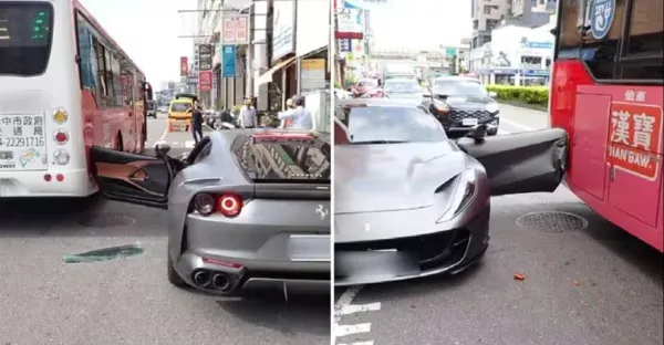 違停又三寶式開車門!「1800萬法拉利」遭公車撞爆毀了,駕駛下場太慘了