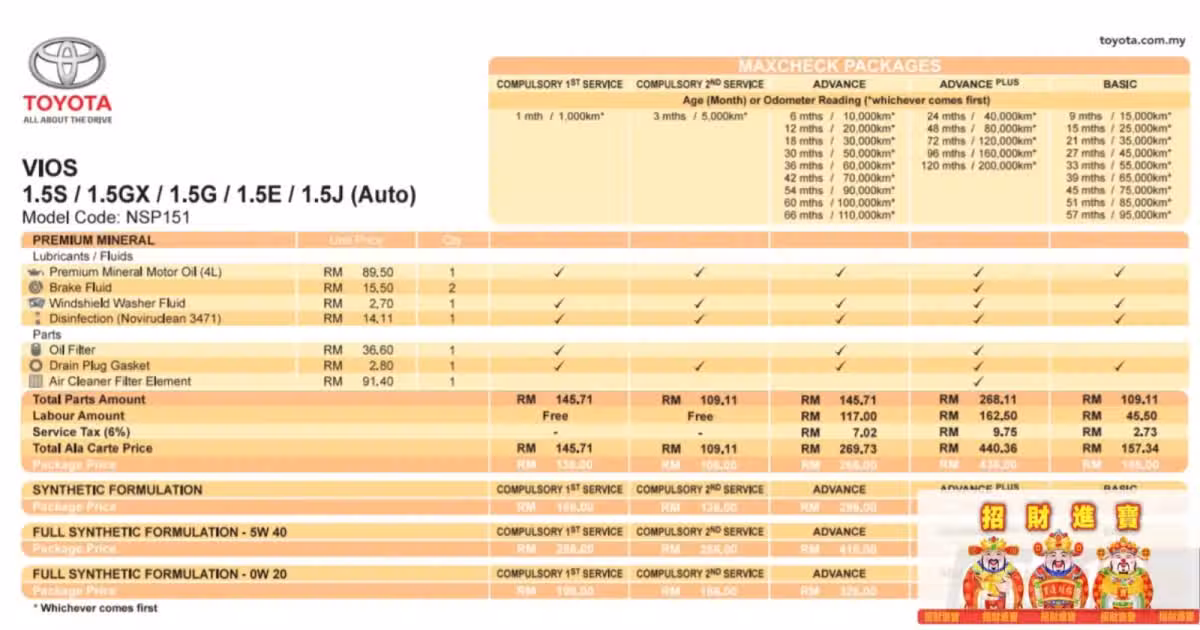 第一年保養費用:RM652 第二年保養費用:RM822 第三年保養費用:RM652 第四年保養費用:RM822 第五年保養費用:RM652 總數:RM3600(以上保養費用是選擇 Toyota 原廠 0W20 全合成引擎油的費用,只供參考) 第一年保養費用:RM832 第二年保養費用:RM1002 第三年保養費用:RM832 第四年保養費用:RM1002 第五年保養費用:RM832 總數:RM4500(以上保養費用是選擇 Toyota 原廠 5W40 全合成引擎油的費用,只供參考)