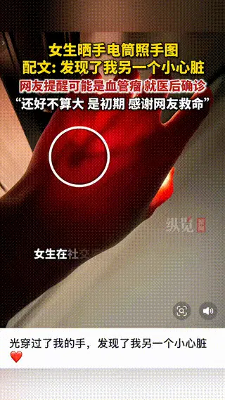 視講的是一位女士用手機電筒照著自己的手,不經意發現了一個「小心臟」。
